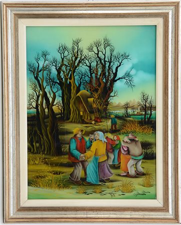 Lalic T. "Festa paesana" 1976, verre peint (cm 60x45). Firmato e datato in...