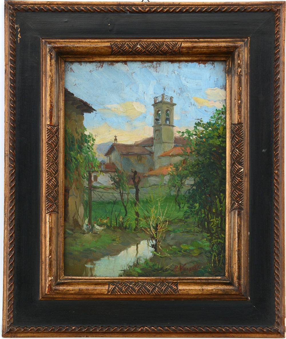 Pietro Verzetti (1876 - 1958)"Scorcio con chiesa" olio su compensato (cm...