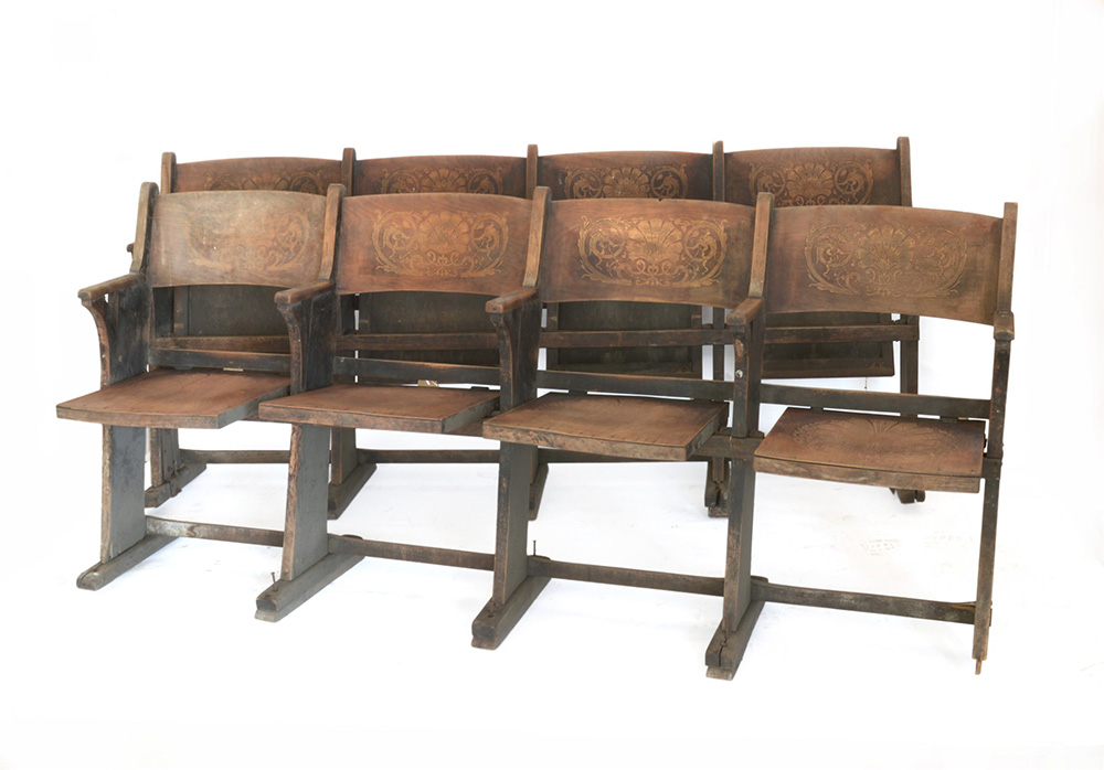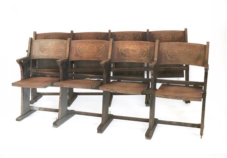 Lotto di due file di sedie per cinematografo da quattro posti ciascuna con sedute e spalliere decorate a fiori stilizzati e volute. Etichette di produzione della fabbrica Mario Gianninone di Milano, primi decenni del secolo XX (difetti)