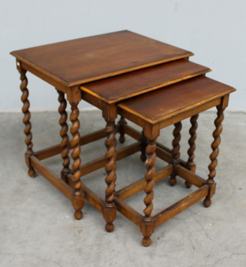 Gruppo di tre tavolini a nido con gambe a torciglione riunite da traverse (cm...