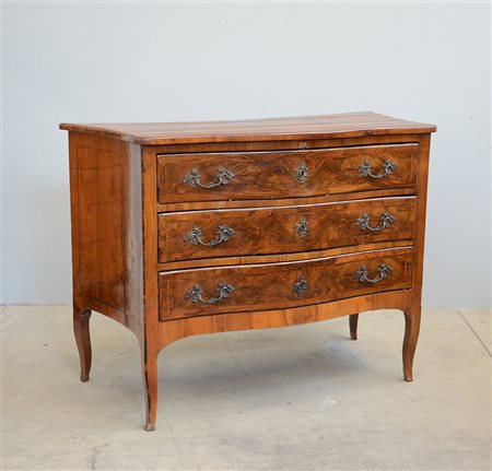 Comò di forma mossa lastronato in noce, radica di noce e filettato. Fronte a tre cassetti, quattro gambe mosse. Guarnizioni metallo. Sec. XVIII (cm 132x97x63)(difetti)