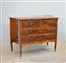 Comò di forma mossa lastronato in noce, radica di noce e filettato. Fronte a...
