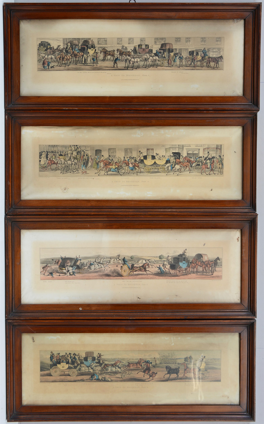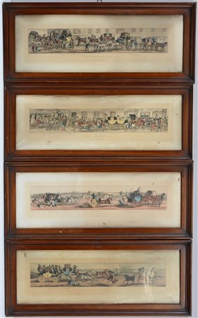 Gruppo di quattro litografie inglesi, intelate a colori, del sec. XIX raffiguranti quattro episodi di una gita a Brighton, in cornici (cm 23x68)(difetti e mancanze)