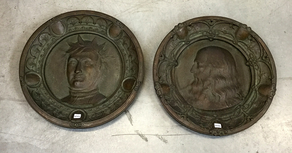 Coppia di piatti da parete in bronzo decorati con l'effige di Dante e di Leonardo in altorilievo (d cm 46)(difetti)