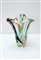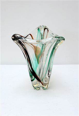 Vaso portafiori in vetro sommerso incolore verde e marrone a sezione triangolare. Anni '60.