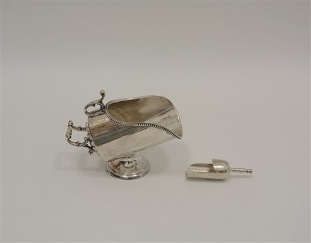 Zuccheriera con cucchiainoin argento, bordo perlinato. Birmingham, inizio...