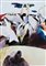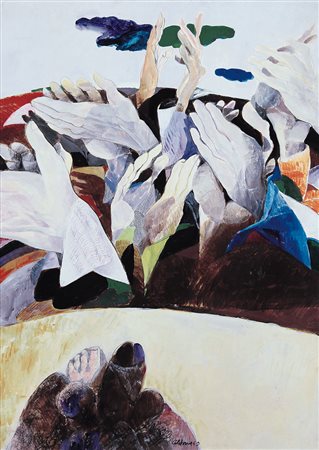 ENNIO CALABRIA Tripoli (Libia) 07/03/1937 - Bagnanti plaudono al sesso di Ascilto, 1969, olio su cartone applicato su tela cm. 70x50, firma e anno in basso al centro, etichetta della Galleria GI3 (Seregno-MI) e timbro della Galleria Ciak (Roma) al retro, opera registrata presso l'Archivio Ennio Calabria come da dichiarazione su foto.