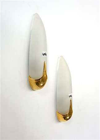 Coppia di appliques a forma di goccia in metallo dorato e vetro acidato. Italia, produzione recente. (h cm 33) (lievi difetti)