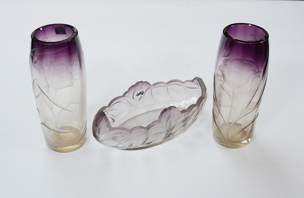 Manifattura cecoslovacca, Moiser. Trittico in vetro molato a fiori composto da due vasi ed una vaschetta con bordi violacei (difetti)