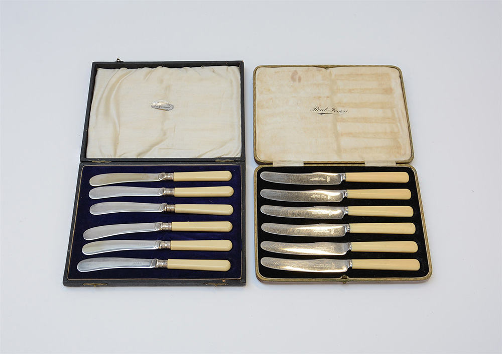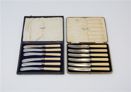 Sei coltelli da dolce e sei spalmaburro con manici in avoriolina. Inghilterra, secolo XX. In due scatole