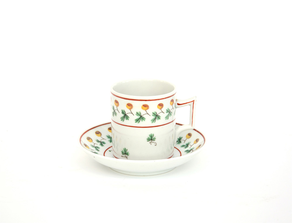 Tazzina da caffè con piattino in porcellana, secolo XIX. La tazzina ‘litron’ con manico a nastro spezzato ed il piattino presentano bordure lineari rosse al cui interno si posiziona una decorazione policroma a bacche con foglie (tazza h. cm. 7)(piattino diametro cm. 12)