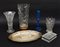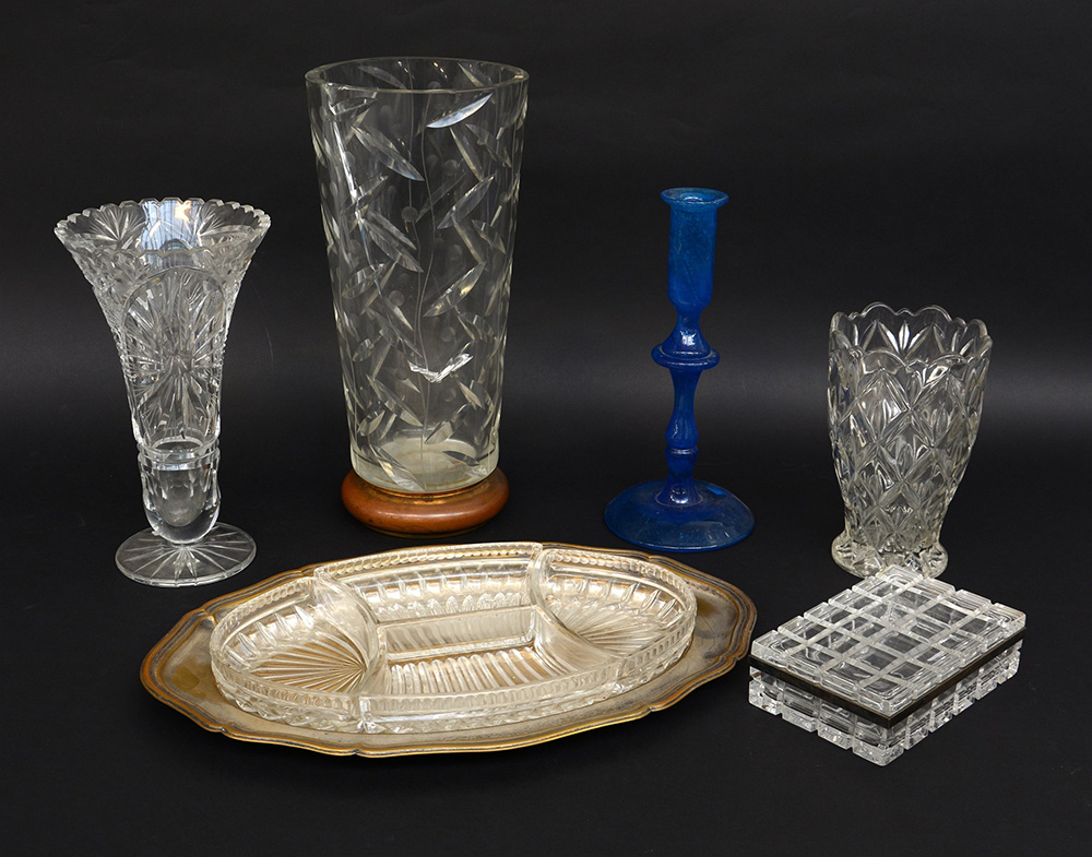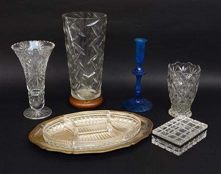 Lotto composto da tre vasi e una scatola con coperchio in cristallo sfaccettato, un candeliere in vetro soffiato blu ed una antipastiera con vasche in cristallo e vassoio in metallo argentato (difetti)