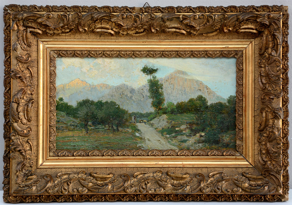 "Scorcio lombardo" olio su cartone pressato (cm 15x27,5) firmato in basso a destra. In cornice in legno e pastiglia dorata (difetti)