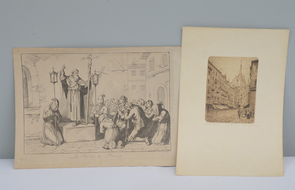 Lotto composto da una stampa da Pinelli ed un'acquaforte raffigurante uno scorcio della vecchia Milano, misure diverse (difetti)
