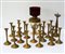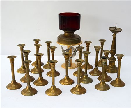 Lotto composto da numerosi candelieri in ottone, una coppa in vetro rosso ed...