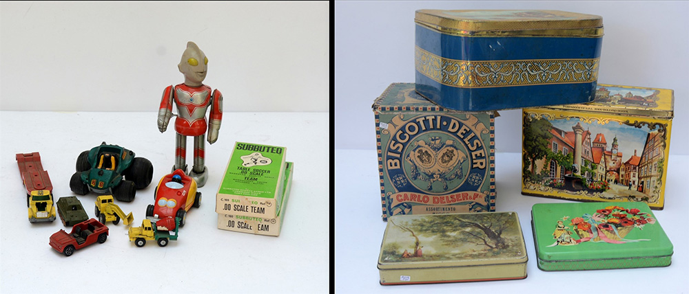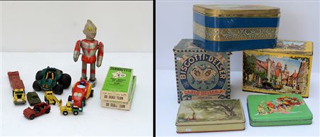 Lotto composto da cinque scatole in latta anni '60, un modello di cucina per bambole e alcuni giocattoli (difetti e mancanze)