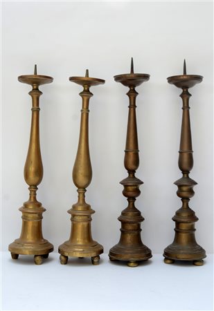 Due coppie di candelieri in ottone con fusto tornito, misure diverse (difetti)