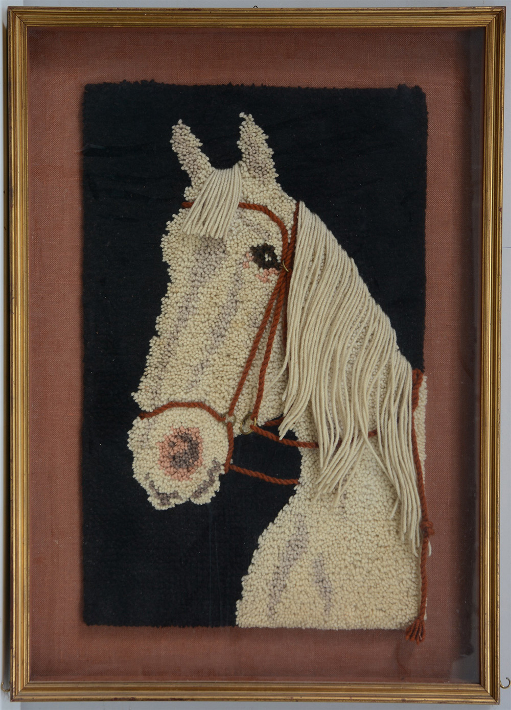 Arazzo tessuto in lana raffigurante testa di cavallo nei toni del beige,...