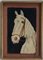 Arazzo tessuto in lana raffigurante testa di cavallo nei toni del beige, marrone su fondo nero, con briglie in evidenza, Italia, metà secolo XX.