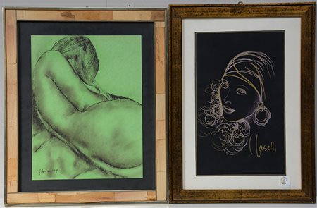 Lotto di due quadri raffiguranti un nudo e un volto femminile, autori, tecniche e misure differenti, in cornici (lievi difetti)