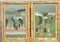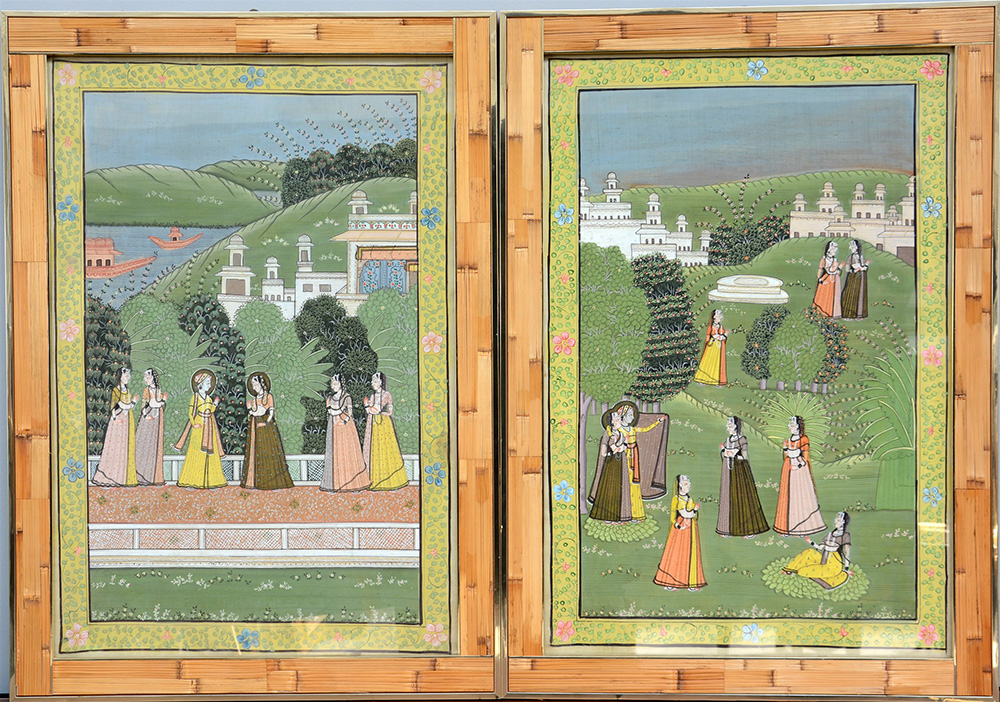 Coppia di dipinti su tela raffiguranti figure femminili in paesaggi, cornici con inserti in bambù (lievi difetti)