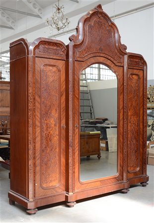 Armadio in noce con anta centrale a specchio, due ante laterali e montanti radicati, cimasa di forma sagomata con profili e specchiature in radica, piedi anteriori a cipolla, secolo XIX (cm 215x274x64) (difetti e mancanze)