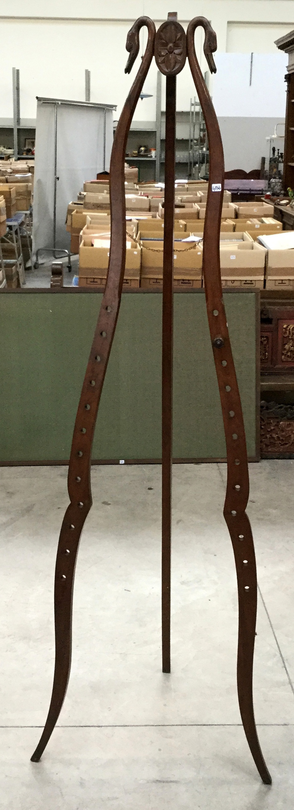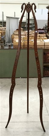 Cavalletto portaquadri con montanti sagomati terminanti a testa di cigno, secolo XIX (h cm 204) (difetti e mancanze)