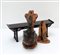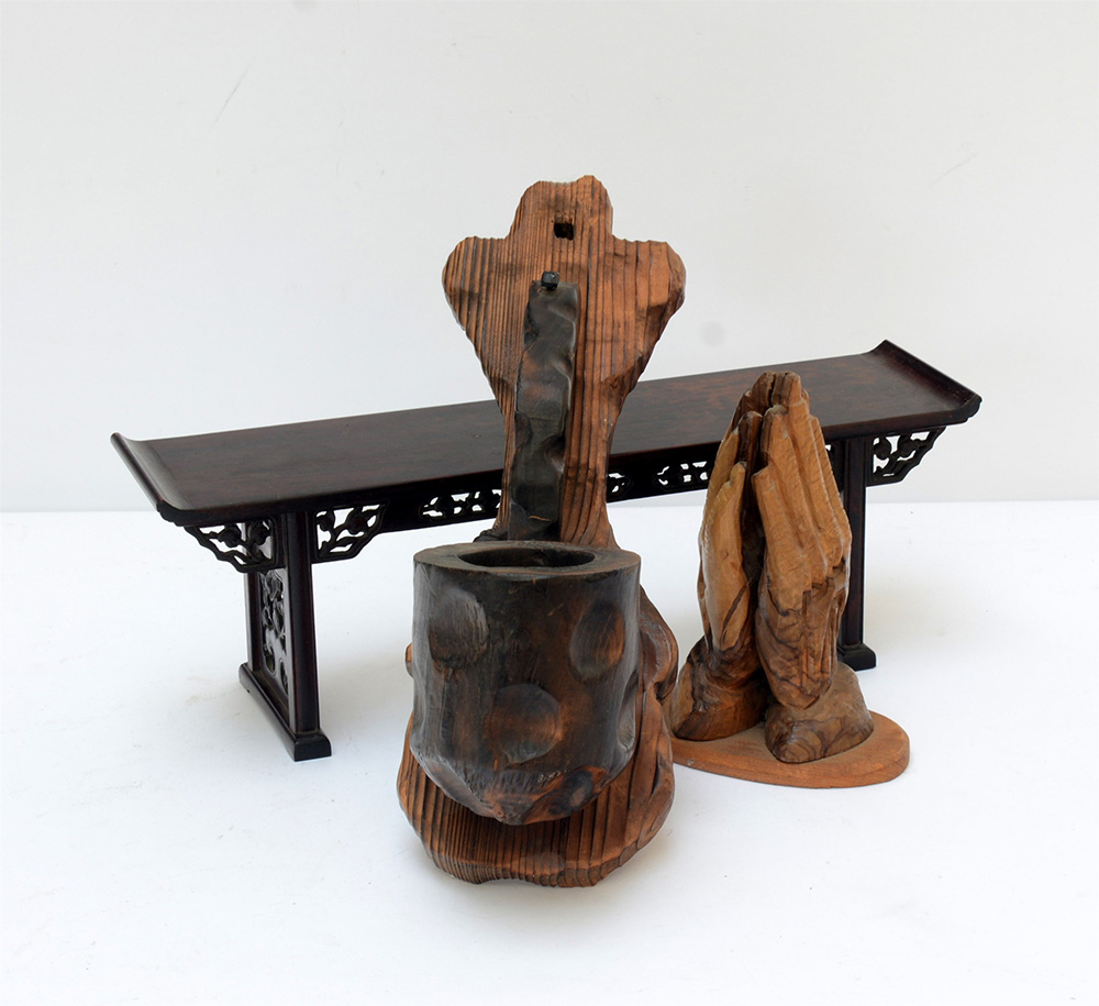 Lotto composto da tre oggetti decorativi in legno: un pannello con pipa, una base orientale e una scultura raffigurante mani in preghiera (lievi difetti)