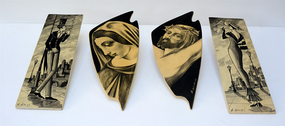 Lotto composto da due coppie di placche decorative in gesso raffigurati Cristo e la Madonna e due figure eleganti in un paesaggio urbano, firmate e datate, autori differenti (h max cm 44) (lievi difetti)