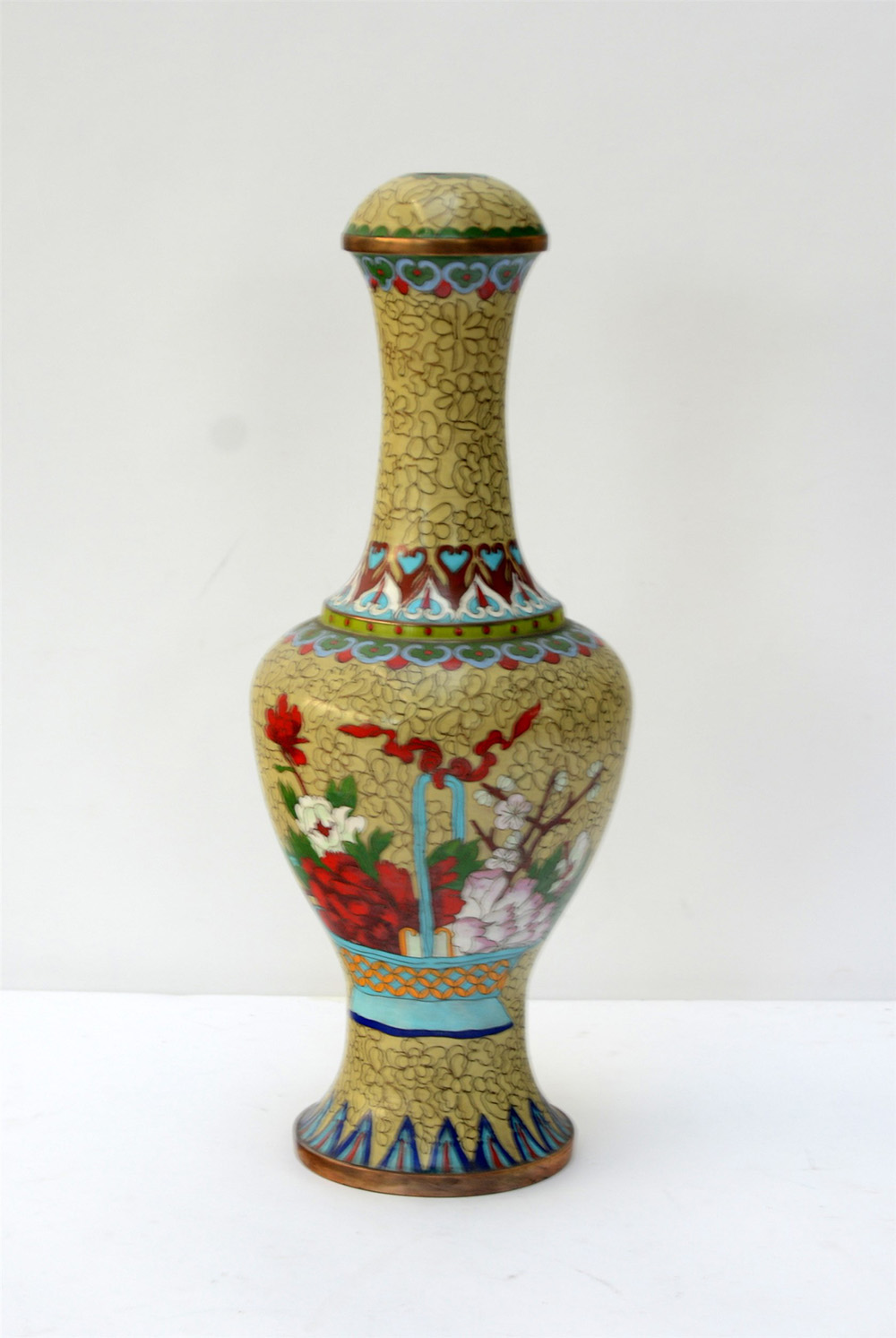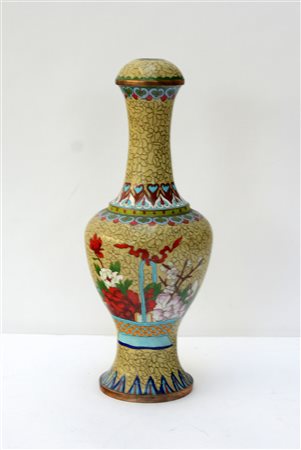 Vaso in metallo cloisonné con decorazione floreale su fondo giallo(difetti)