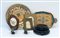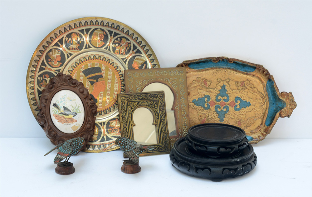Lotto composto da un piatto in metallo con profili egizi, un vassoietto in legno dipinto, due specchietti con cornici in metallo, una placca ovale in ceramica con cornice, due basi per vasi e due uccelli in metallo con applicazioni in smalti (difetti e mancanze)