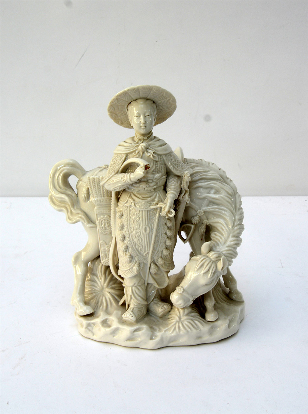Gruppo in porcellana Blanc-de Chine raffigurante guerriero con armatura a cavallo (difetti e mancanze)