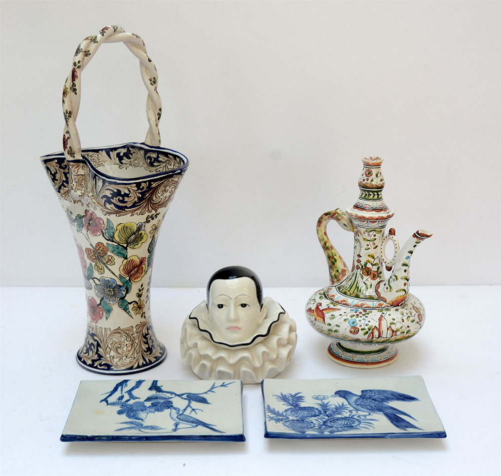 Lotto composto da una scatola in ceramica con coperchio a testa di Pierrot, due vassoietti decorato con rami e uccelli, un versatoio e un cestino in ceramica di manifattura faentina a decori naturalistici (h max cm 48) (difetti)