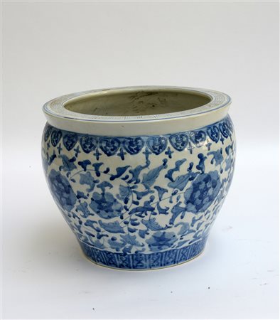 Manifattuar di Cina. Cachepot moderno in porcellana decorata in blu su fondo bianco con fiorni di loto (lievi difetti)