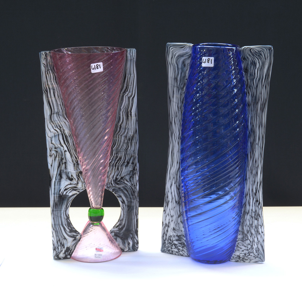 "I Lirici"Lotto di due vasi in vetro trasparente blu e rosa. (h cm 44; h cm 42)