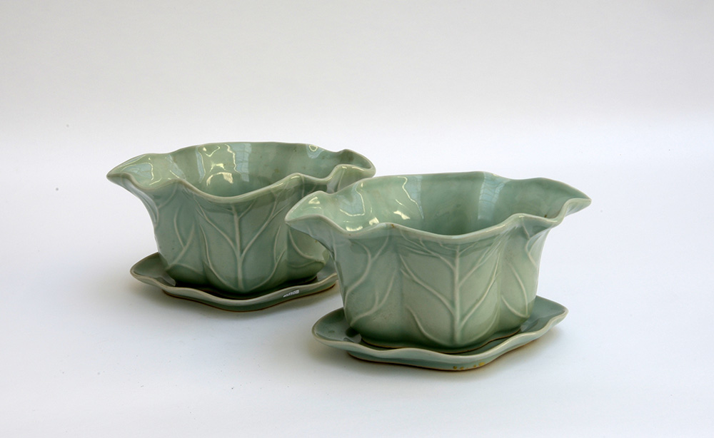 Coppia di vaso e sottovaso in porcellana ad invetriatura celadon a guisa di foglia di loto moderna, marchio apocrifo alla base (lievi difetti)
