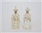 Coppia di sculturine in porcellana raffiguranti figure orientali con volti dipinti ed abiti con profili dorati. Copricapi applicati (h cm 14) (difetti e mancanze)