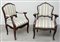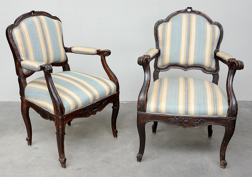 Due poltrone in noce con schienale, braccioli e montanti sagomati ed intagliati. Gambe e fascia mosse, ricoperte con tessuto a righe. Sec. XVIII (difetti)