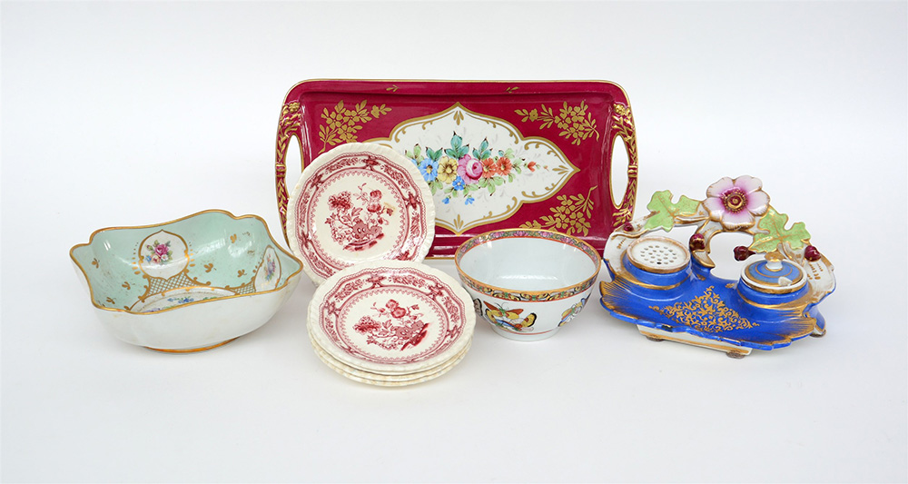 Lotto composto da un vassoietto ed un centrotavola in porcellana di manifattura francese, cinque piattini inglesi, una ciotola orientale ed un calamaio in ceramica (difetti)