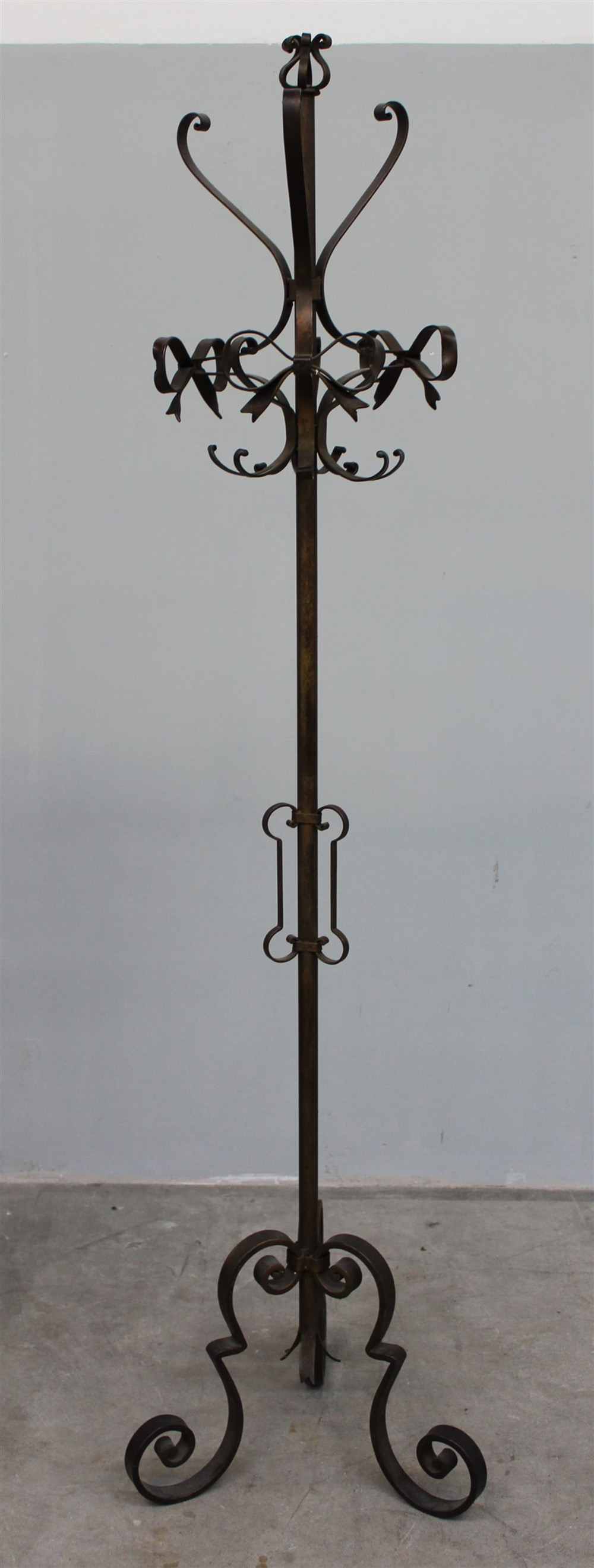 Attaccapanni da terra in ferro battuto con base tripode e grucce a fiocco (h cm 190) (difetti)