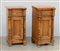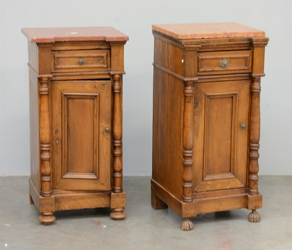 Coppia di comodini ad un anta e un cassetto riquadrati, montanti a mezza colonna, piani in marmo (lievi differenze, un piano in marmo non pertinente) (difetti)