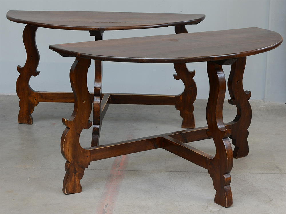 Coppia di console a mezza luna con gambe sagomate e traverse dritte (cm 133x80x65) (difetti)