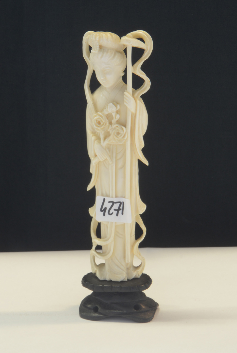 Scultura in avorio raffigurante immortale femminile, base in legno (lievi difetti)