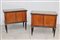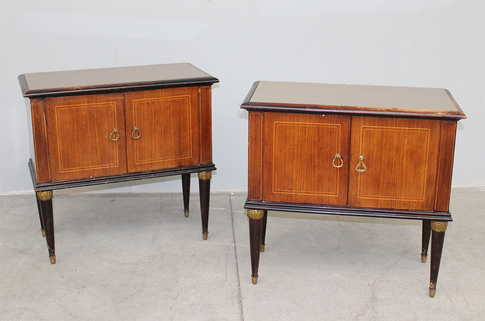 Coppia di comodini a due battenti lastronati e filettati, gambe rastremate con applicazioni in metallo, piano con vetro. Anni '50 del secolo XX (cm 66x64x33) (difetti)