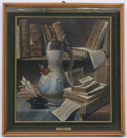 Ignoto, "Natura morta con libri e brocca" olio su tela (cm 56,5x51) in cornice (difetti e restauri)