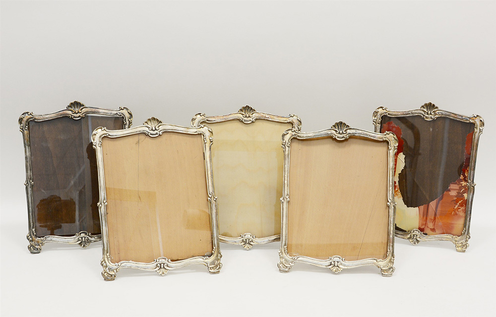 Gruppo di cinque cornici da tavolo Sheffield di forma sagomata decorate con motivo di conchiglia stilizzata (cm 28x21) (difetti)
