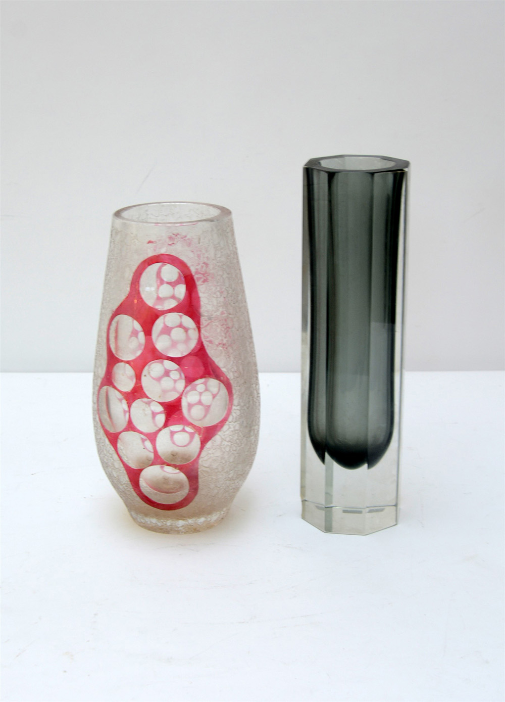 Lotto composto da un vaso ottagonale in vetro sommerso incolore e grigio unito a un vaso in vetro incolore e rosa corroso all'acido e decorato a lenti scavate alla mola. Seconda metà secolo XX. (difetti)