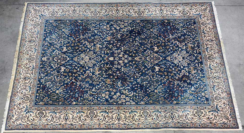 Annodato in lana e seta. Disegno floreale sparso con animali policromo su fondo azzurro. (cm 300x205) (difetti)