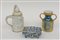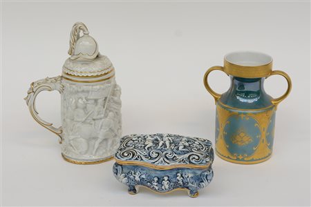 Lotto composto da un vaso biansato in porcellana smaltata verde con rilievi in oro, un boccale e una scatolina con coperchio decorati con figure in bassorilievo (h max cm 27) manifatture differenti (difetti)