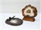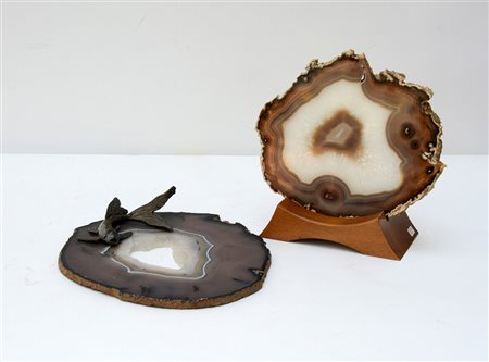 Lotto composto da due sezioni d'agata, una su piedistallo, l'altra con un'applicazione in metallo raffigurante un pesce (lievi difetti)